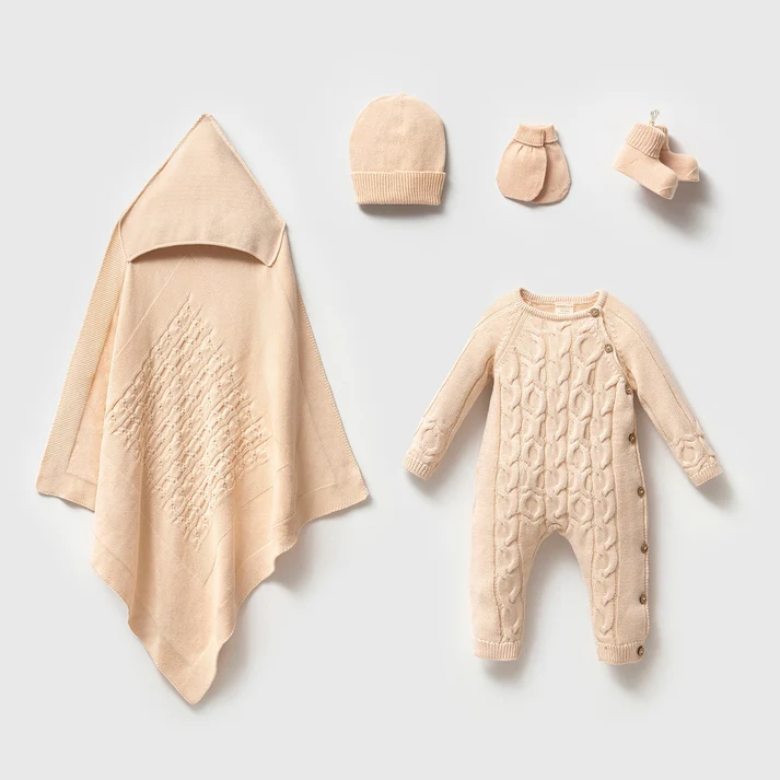 Bej Kundaklı Tulumlu Bebek 5’li Hastane Çıkış Seti Organik Premium