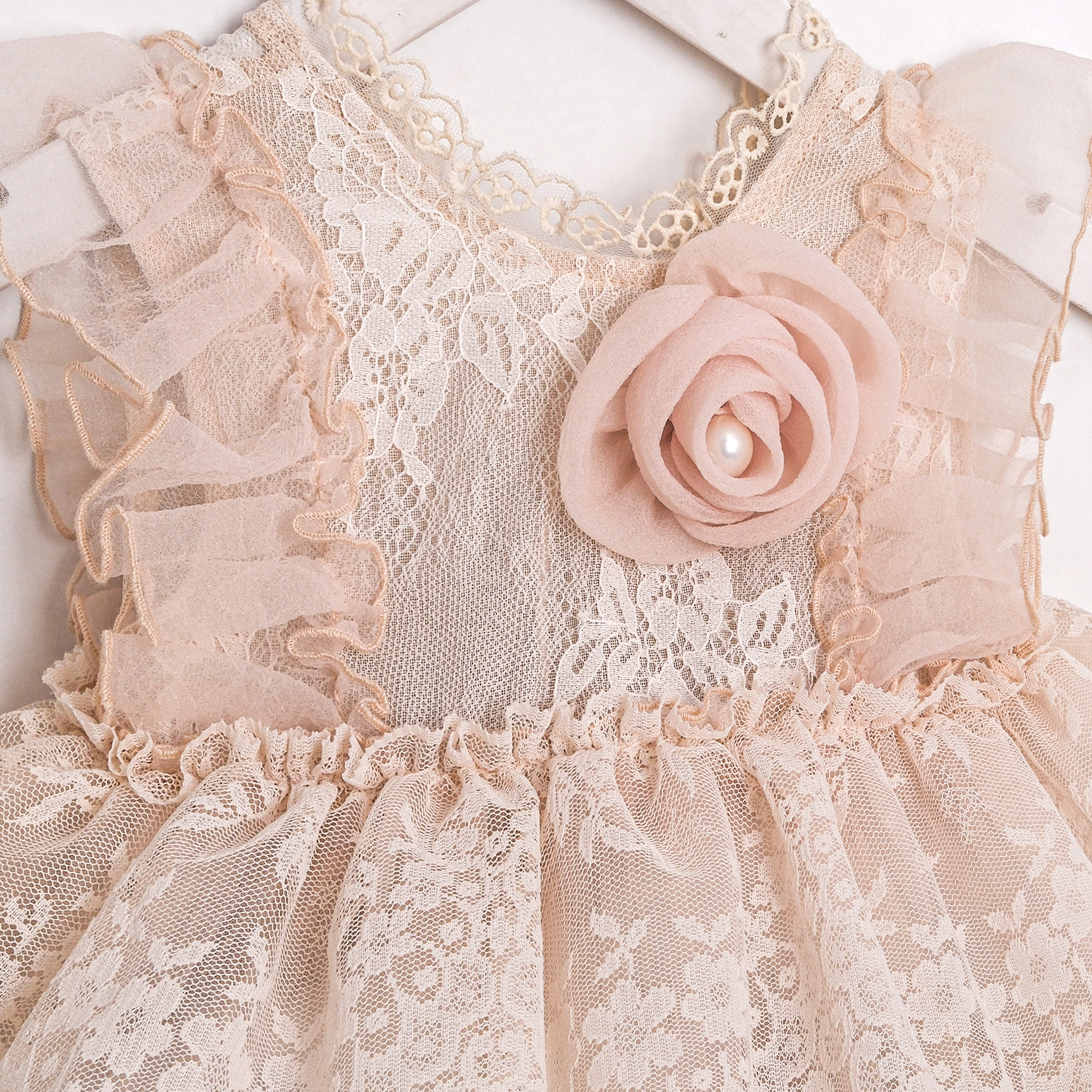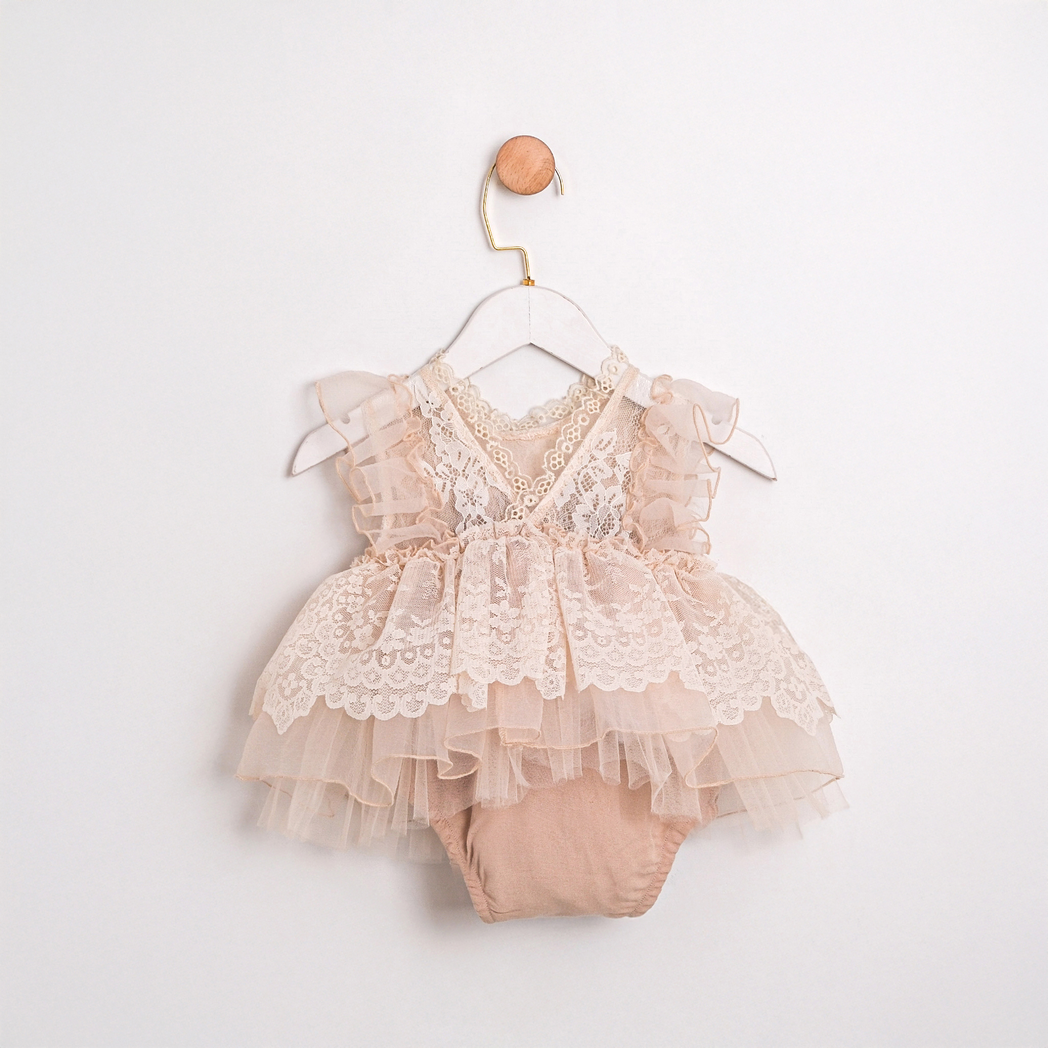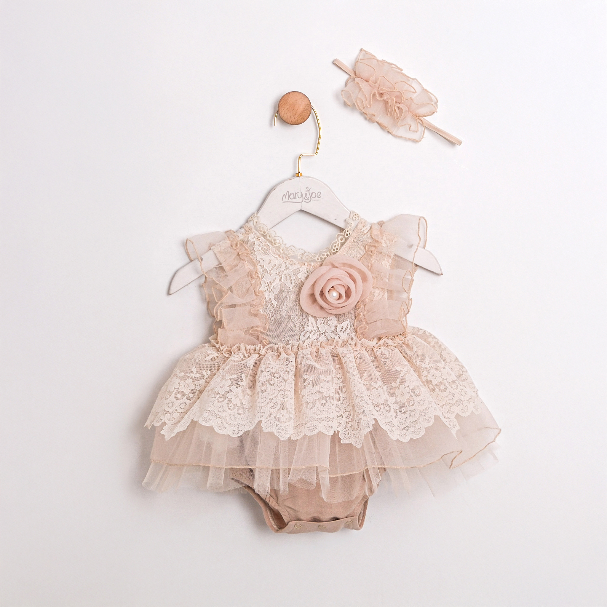 Krem Eva Bony Dantelli Saç Aksesuarlı Kız Bebek Elbise Tulum