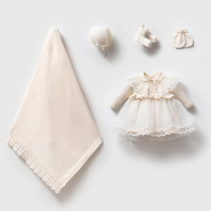 Triko Prenses Elbiseli Kız Bebek 5’li Hastane Çıkış Seti Organik